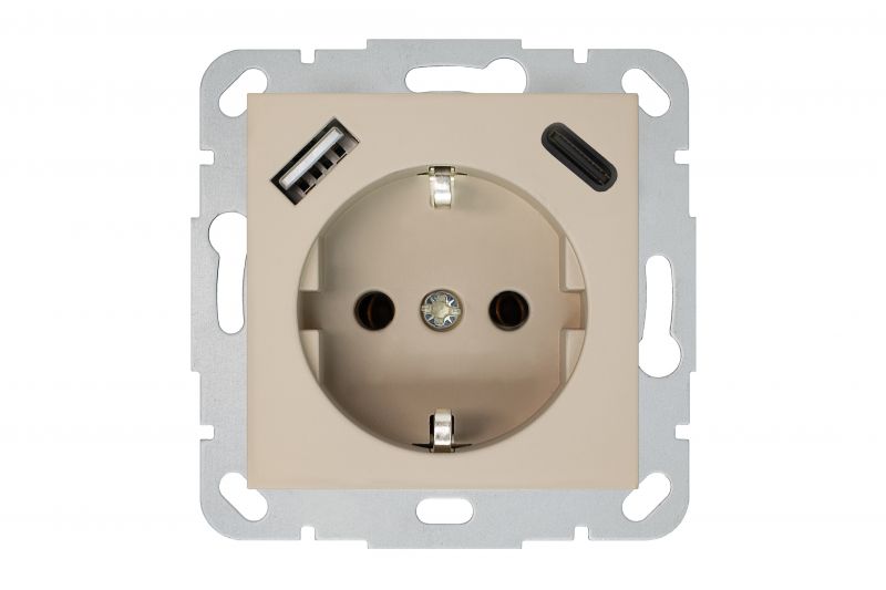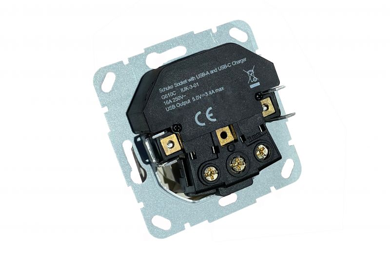 IUK-3-01.R.ONC16A. 250V~ SCHUKO® kištukinis lizdas su naujausio tipo, išmaniu 25W, 3,4A USB A+C krovikliu. Gaminys parduodamas be rėmelio.